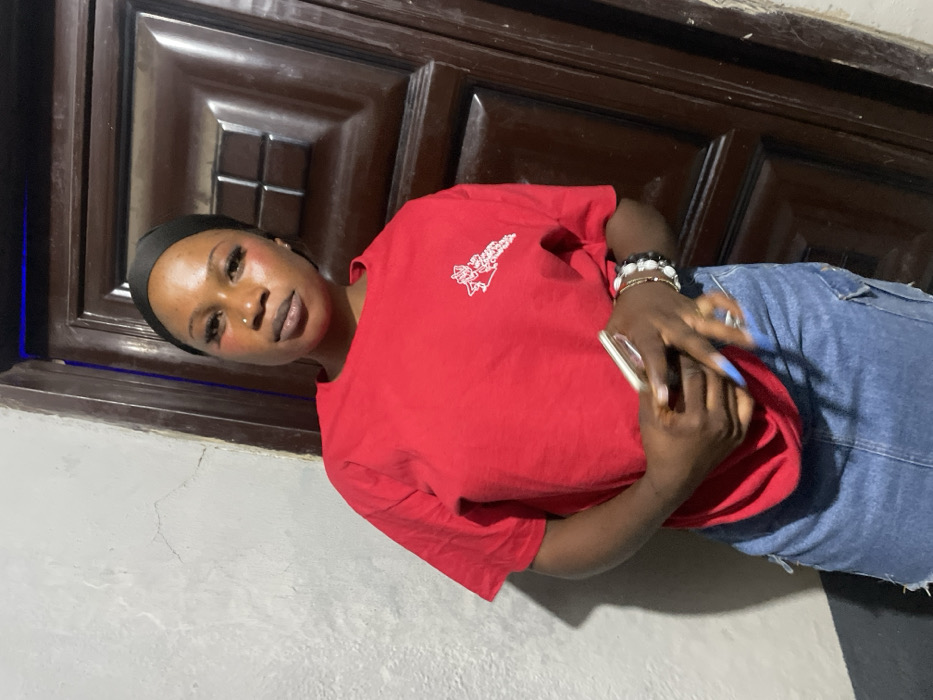A woman poses in front of a dark wooden door or wall. She wears a red t-shirt with a white design on the left side and blue jeans. Her hands are in front of her, holding a phone or small device, and she's wearing bracelets. She has a black headband and visible makeup including blush, lip color, and false eyelashes. The lighting is dim, casting shadows around her. The walls or surfaces behind and beside her appear to be a light gray or white color.
