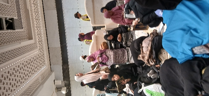 This image depicts an interior area of the Grand Mosque (Masjid al-Haram) in Makkah Al Mukarramah, Saudi Arabia. The scene shows multiple individuals, predominantly women, occupying a well-lit hall. In the mid-ground, a woman wearing a light beige headscarf and dark attire stands, holding a pair of shoes in her right hand and a patterned shoulder bag. Next to her, a woman in a pink headscarf and patterned skirt sits on the tiled floor, holding an object in her hands, with a brown woven bag nearby. In the left foreground, a woman in a black headscarf is seated, actively reading an open book. Adjacent to her, another woman in black is seated, looking at a mobile phone. Further to the right, a woman in a maroon headscarf is also seated on the floor. Various other individuals, including men, are visible in the background, some standing and some seated. Personal belongings such as bags, folded clothing (including a blue t-shirt), and additional shoes are distributed on the floor around the individuals. The floor is light-colored and tiled. The ceiling features intricate white geometric patterns with integrated linear lighting. White, curved, low-rise dividers or seating units are visible throughout the space. A white security camera is mounted on a wall in the upper left background.
