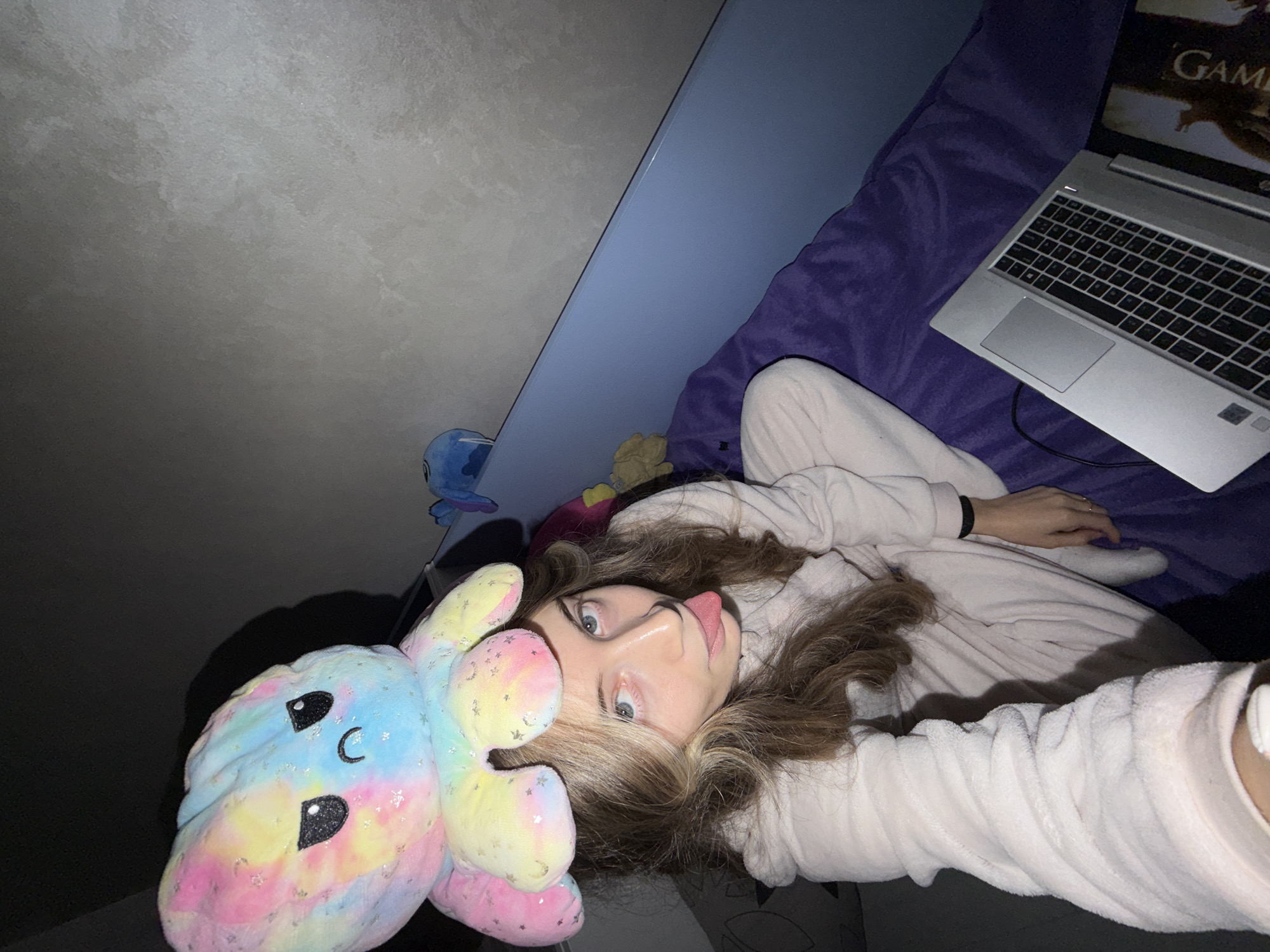 A young person lies in bed, pajama-clad with a plush, cartoon-faced octopus toy held up. A laptop rests on a purple duvet, the screen displaying content from "Game of Thrones". The bedroom has a pale blue headboard and a light grey wall. Location: Not ascertainable; the image does not contain forensic details indicating the city of Plovdiv, Bulgaria.