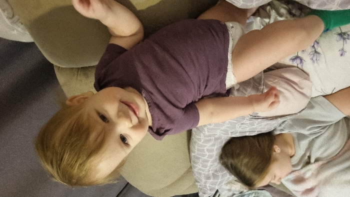 A baby in a diaper and purple shirt smiles at the camera, reclining on a cushioned surface. A child sleeps partially under a gray patterned blanket beside the baby. The baby has blonde hair and fair skin. A green sock is visible on the baby's foot. The scene is indoors.