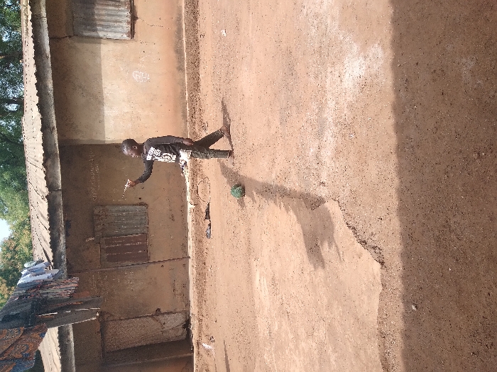 In Godogodo, Nigeria, a young child walks left to right across an unpaved reddish-brown dirt ground