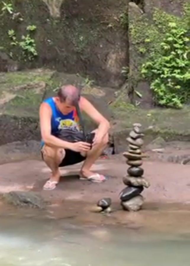 A man squats beside a stream, taking a photo with his smartphone of a rock cairn. He is wearing a blue sleeveless tank top, black shorts, and white flip-flops. He has short, light-colored hair and a crossbody bag. The rock cairn consists of about ten stacked stones of varying sizes. To its left, near the water's edge, there is a single small rock. Behind the man and cairn is a moss-covered rock wall with green vegetation. The stream flows past the man and rock structure. Another person wearing traditional Balinese attire is seen briefly passing behind the man.