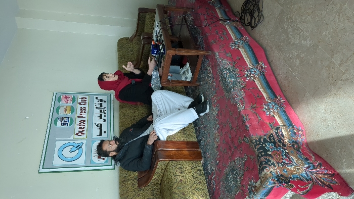 Two people sit on a patterned sofa beside a small wooden table, which holds a device. A woman in a red headscarf gestures as she speaks. The man beside her wears a dark jacket and light pants. A bulletin board with the words "Quetta Press Club" is visible on the wall. A patterned rug covers the floor.