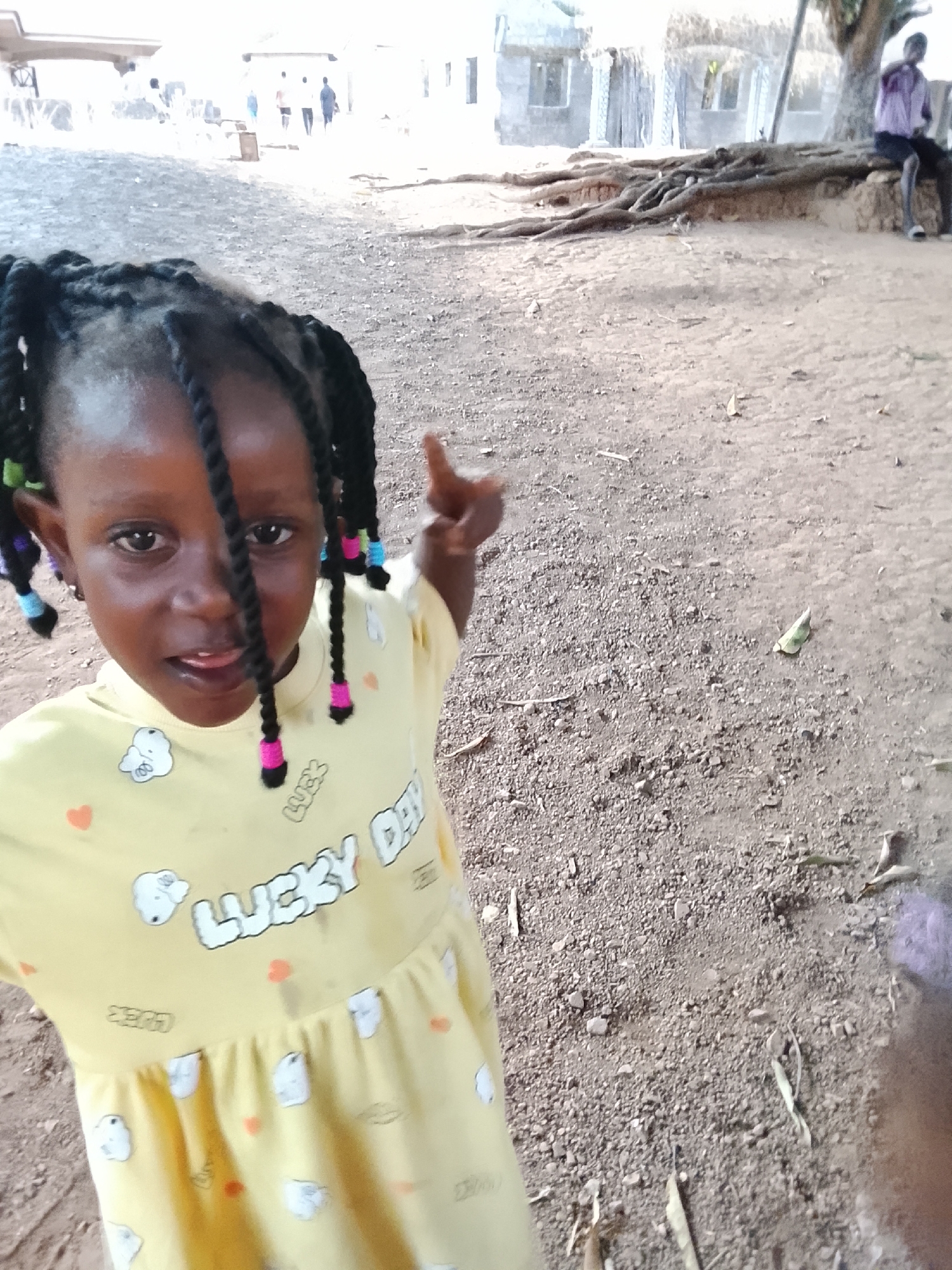 The image depicts an outdoor scene in Akwanga, Nigeria, characterized by dry, light brown, pebbly earth. In the foreground, a young Black female child with dark braided hair, adorned with multicolored beads (pink, green, blue), faces the camera directly. She wears a yellow dress patterned with "LUCKY DAY" text, white cartoon figures, and small orange hearts. Her left index finger is raised, and her tongue is slightly extended. In the midground, a large tree with prominent, exposed root systems grows over an elevated dirt mound. A male individual, dressed in a light-colored top and dark shorts, is seated on this mound under the tree. The background reveals several blurred figures walking in the distance and multiple simple structures, some appearing to be concrete block buildings with windows and possibly thatched or light-colored roofs. Scattered dried leaves are visible on the ground. The scene is brightly lit, suggesting daylight.