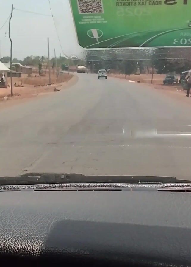 view from inside a vehicle, likely a car, driving on a paved road through a rural area. The road has visible cracks and repairs. There are a few other vehicles on the road ahead, including a white car and what appears to be a truck. The landscape consists of trees, low-lying vegetation, and scattered buildings along the roadside. A sticker is adhered to the windshield, partially obstructing the view. The overall impression is that of a journey through a sparsely populated region on a sunny day. There are people walking on the right shoulder.
