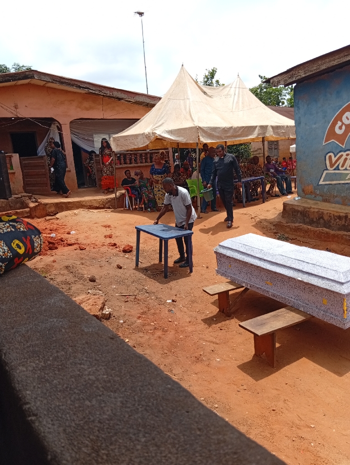This image depicts an outdoor gathering in Ogidi, Nigeria, on reddish-brown dirt ground