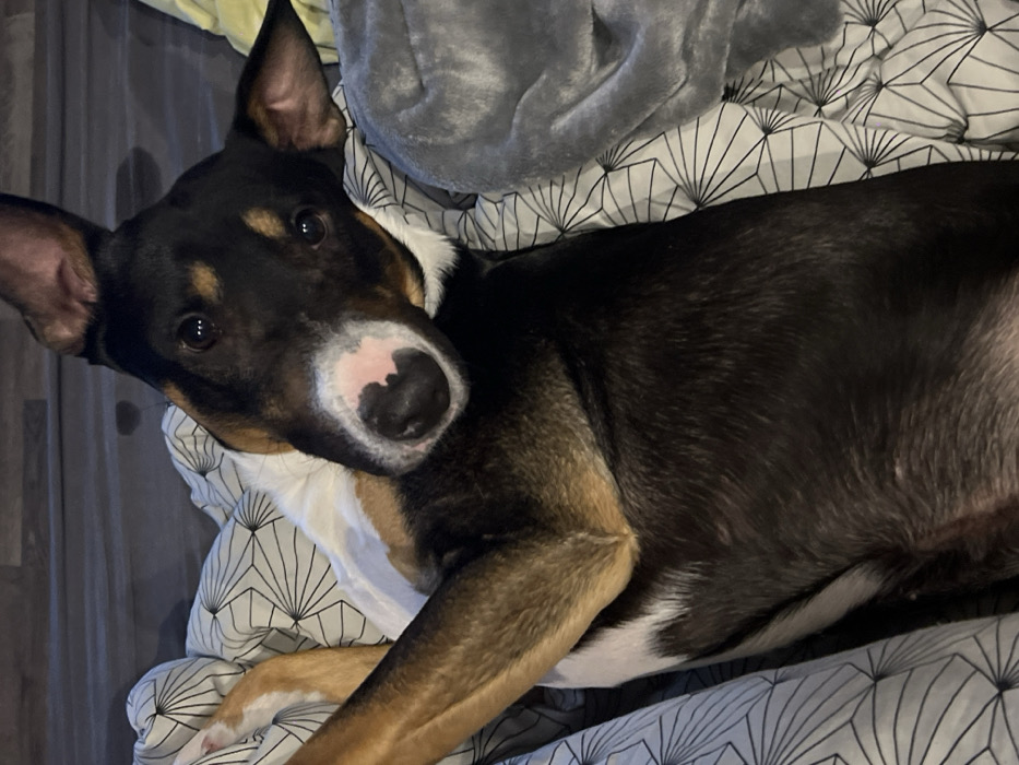 - "A dog with black, brown, and white fur lies on a bed with patterned sheets" by FM-qTHAd2, licensed under CC BY 4.0