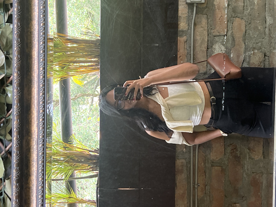 A young woman takes a mirror selfie. She wears dark pants, a light top knotted at the waist, and glasses. A brown purse hangs from her shoulder. The mirror is framed with a decorative gold-colored border. The reflection shows greenery through a window on one side and a brick wall on the other. The flash reflects on the mirror.