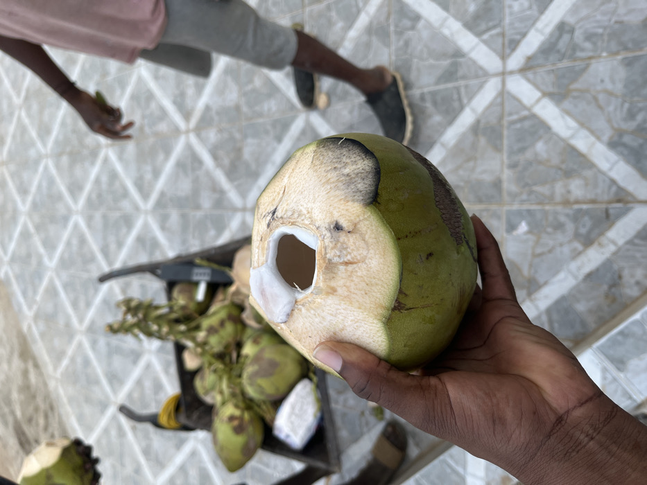 An outdoor scene in Weija, Ghana, shows a close-up of a dark-skinned hand holding a green young coconut