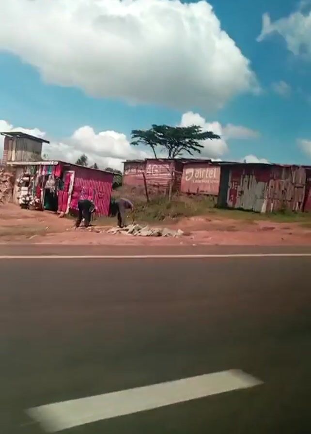The video, taken from a moving vehicle, shows a roadside scene under a partly cloudy blue sky. The road is black asphalt with a white lane marker. The camera pans, revealing a series of small, makeshift buildings or stalls lining the side of the road. These structures appear to be constructed from corrugated metal and painted in various colors. People can be seen near these stalls. A large truck passes the camera at one point. The ground around the stalls is reddish-brown, contrasting with the green foliage of a tree in the background. Some parked vehicles are also visible near the stalls. A tall light pole stands by the roadside.