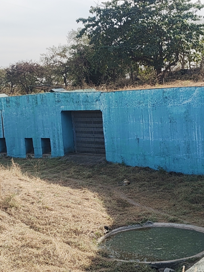 An outdoor scene in Sandhbeda, India, features a large feline, identified as a leopard or cheetah due to its spotted coat, resting on sparse, dry brown grass. The animal is positioned in the middle ground, near the base of a weathered, light blue concrete wall. This wall features a central, dark recessed opening secured by a closed metallic accordion-style gate. To the left of the gate, at least three smaller, square-shaped openings are visible within the wall. The ground in the foreground slopes downward, covered predominantly by dry, light brown grass and dirt. In the lower right corner, a circular, shallow basin filled with greenish water is present. The background, above and behind the concrete structure, consists of dense green and brown trees under a clear, light sky. No humans or additional animals are present.