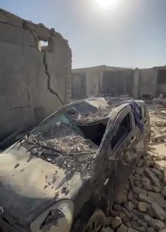 car crushed under the rubble of a collapsed building. The car is gray and partially covered in debris. The building behind it is heavily damaged, with large cracks running through the remaining walls. Bricks and other construction materials are scattered around the car. The scene is bathed in bright sunlight under a clear blue sky. The overall atmosphere is one of destruction and devastation.