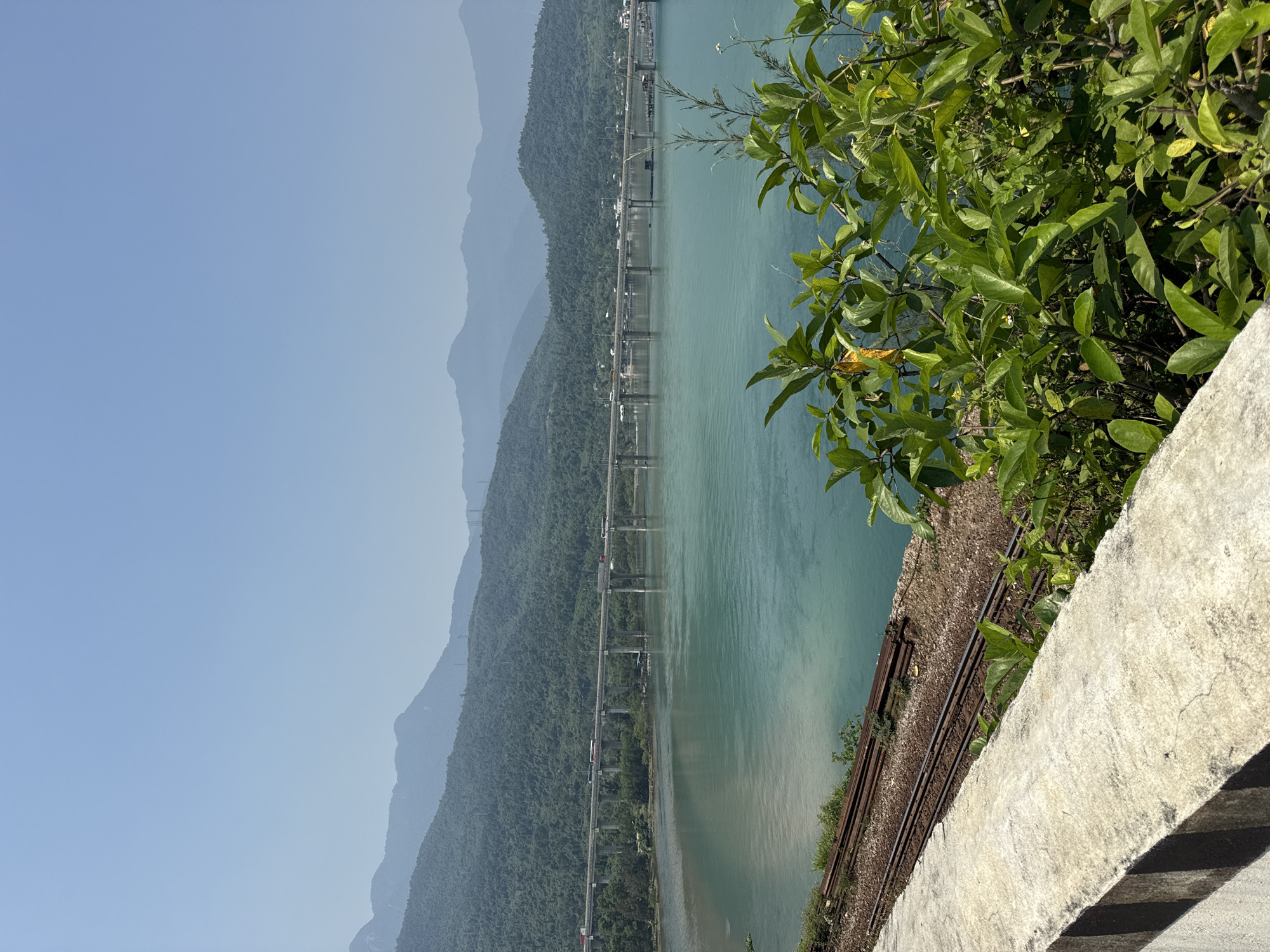 panoramic view of a bridge over a river, situated in a mountainous region. The bridge is long and supported by numerous pillars, carrying traffic across the water. The surrounding landscape features lush, green mountains that fade into the background. The river itself appears calm and reflects the sky. In the foreground, there is a concrete barrier with vegetation growing nearby, adding to the natural scenery. The city of Huế is not directly visible, but the landscape is consistent with the mountainous regions in and around the city. There are no people visible in the image.