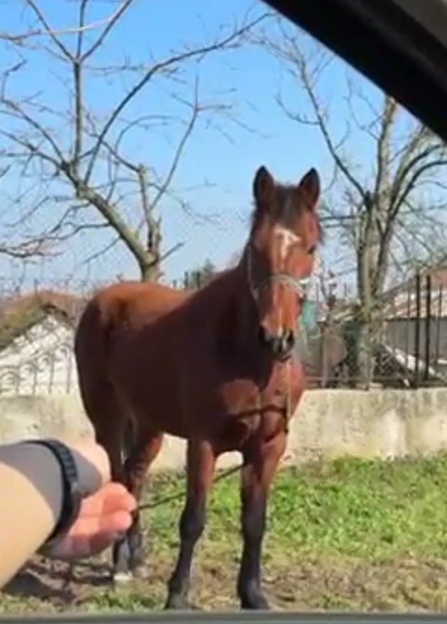 The video, shot from inside a vehicle on a sunny day, focuses on a brown horse standing outside in a grassy area