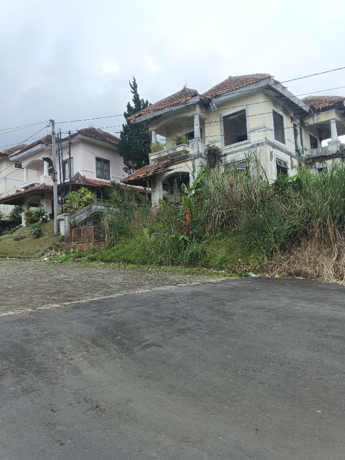 This image displays a residential street scene in Saisetha, Laos, under an overcast sky. The foreground features a dark asphalt road surface, with a lighter-colored paved area, consistent with interlocking bricks, visible to the immediate left. Two multi-story houses are positioned on an upward slope in the midground. The house on the left is a two-story structure with light pink exterior walls, a reddish-brown tiled roof, and white pillars supporting an upper balcony. A utility pole with multiple power lines is situated in front of this house, and a brown metal gate is visible at the base of a path leading to its entrance. The house on the right, also two-story with a reddish-brown tiled roof, appears to be in a state of disrepair, featuring weathered cream-colored walls with significant staining and multiple empty window frames. This structure is heavily obscured by dense, overgrown green and dry vegetation, including a banana plant, which extends from the roadside up its facade. A tall, dark green coniferous tree stands between the two houses. No individuals are present in the scene.
