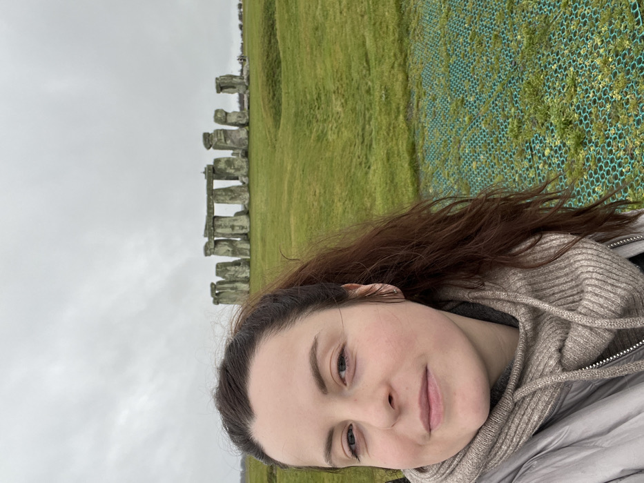The image displays a selfie-style photograph featuring an adult female in the foreground against the backdrop of Stonehenge, located near Larkhill, Wiltshire, United Kingdom