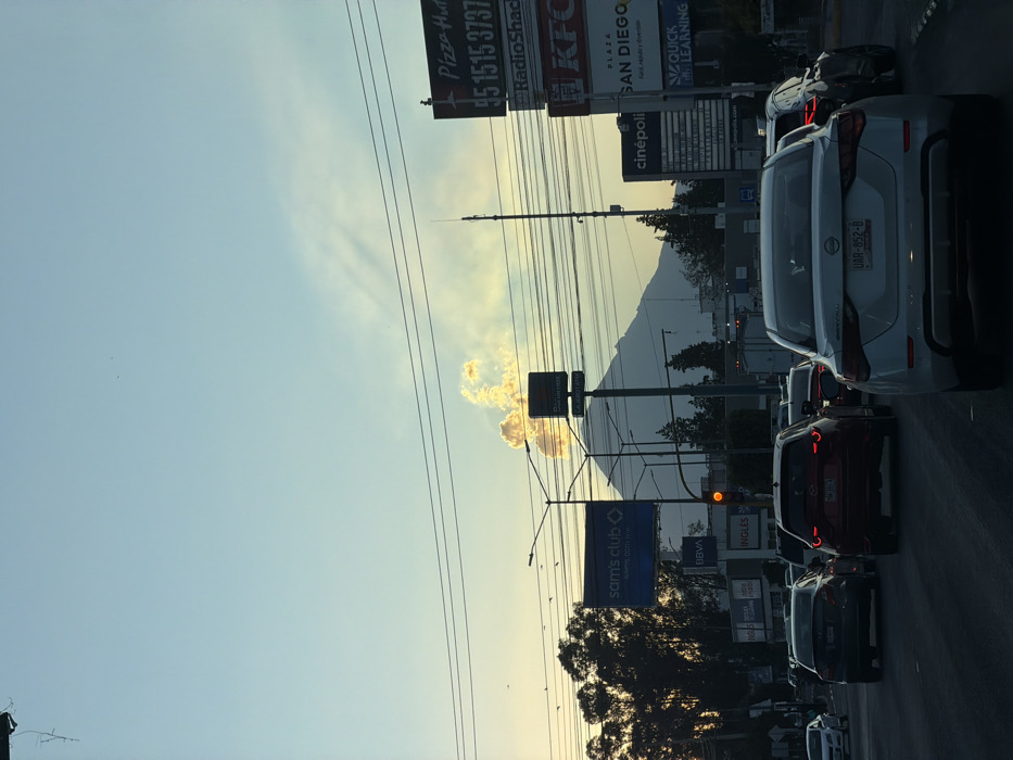 A daytime street scene showing traffic backed up on a busy road. Signs for various businesses including Pizza Hut, KFC, RadioShack, Sam's Club, and Cinepolis are visible. In the background, a mountain is present. The sky is light blue with some yellowish clouds, and power lines run across the sky. Cars are lined up in the foreground. A traffic light is visible in the middle.