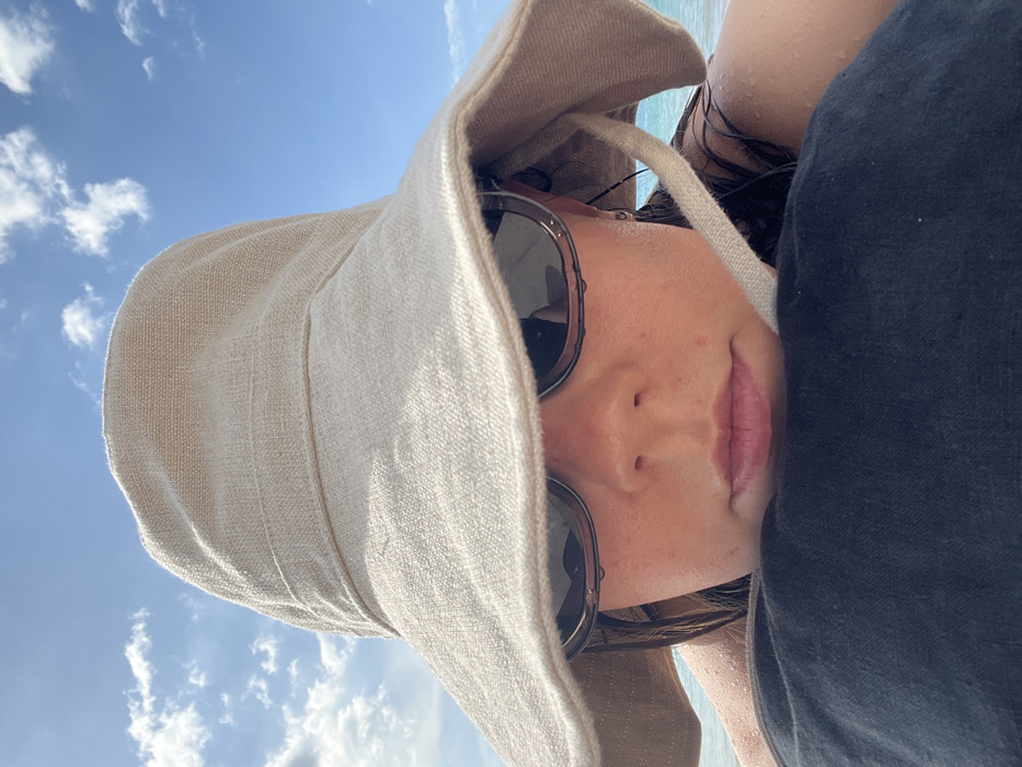 A low-angle close-up depicts an individual in Choeng Thale, Thailand, at a beach or coastal location. The person, viewed from the neck up, wears a wide-brimmed, light-beige fabric sun hat and dark-lensed sunglasses with light frames, obscuring their eyes. Drops of water are visible on the sunglasses and the person's wet, dark hair under the hat. The nose and closed lips are visible below the sunglasses. The individual's head appears to be resting on a dark-colored surface or garment in the foreground. The background consists of a clear blue sky with scattered white clouds, and visible turquoise water on either side, consistent with an ocean environment.