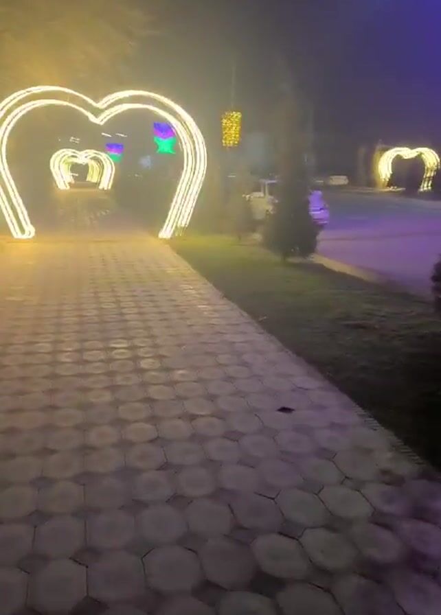 A low-angle, medium shot captures a paved path adorned with illuminated heart-shaped arches leading into the distance