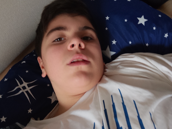 A young male, possibly adolescent, is depicted in a close-up, upward-angled view, lying down on a bed