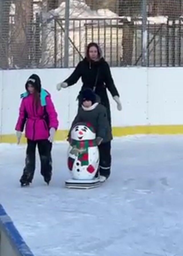 A sunny day at an ice rink shows three people: a girl in a pink jacket, a woman in a black coat, and a young boy in a green jacket. The boy is using a snowman-shaped skating aid to stay upright and move along the ice. The woman, presumably his mother, is skating alongside him, offering guidance and support. The girl in the pink jacket is skating ahead of them. The ice rink is surrounded by a low wall. In the background, trees and a fence are visible.