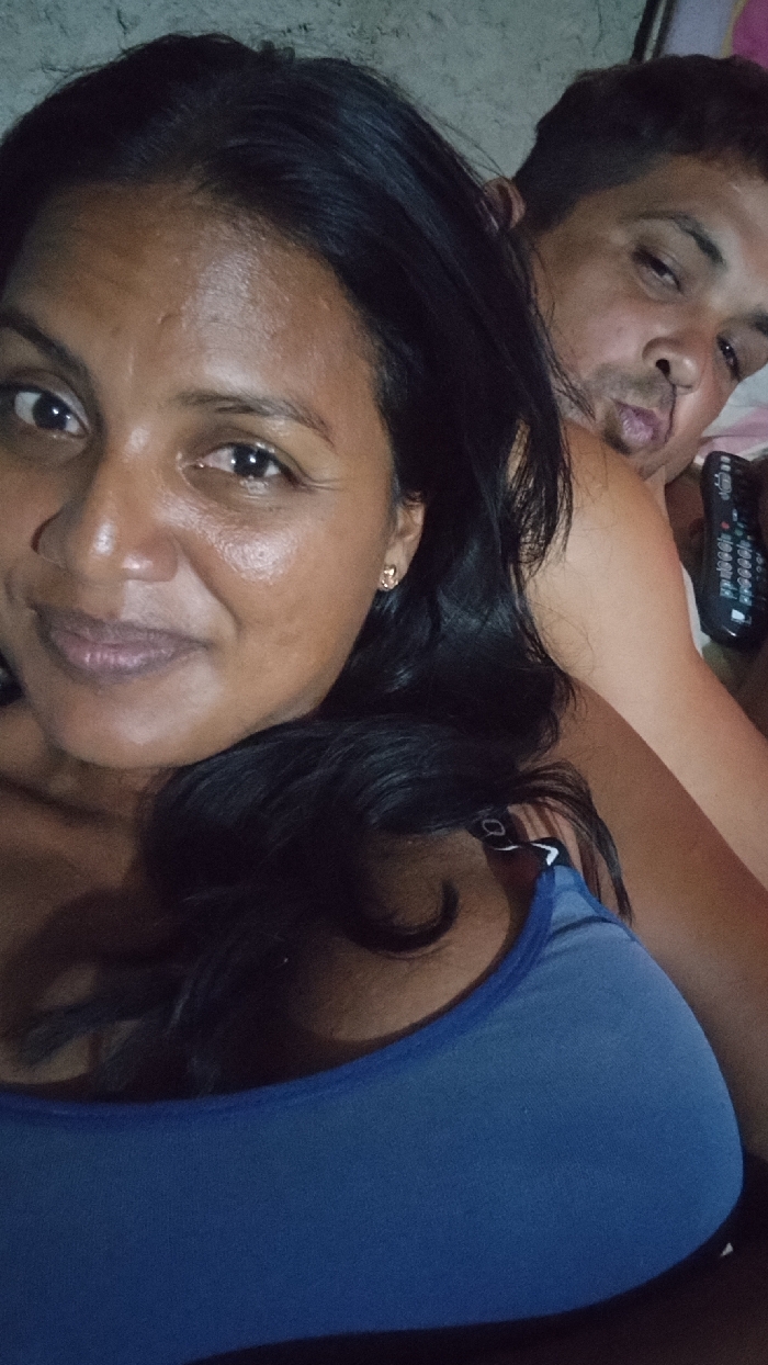 A selfie shows a woman with dark hair wearing a blue tank top. She has tan skin and is smiling slightly at the camera. Behind her is a man with short dark hair making a kissing face. He is shirtless and holding a black remote control. The background appears to be a plain wall.