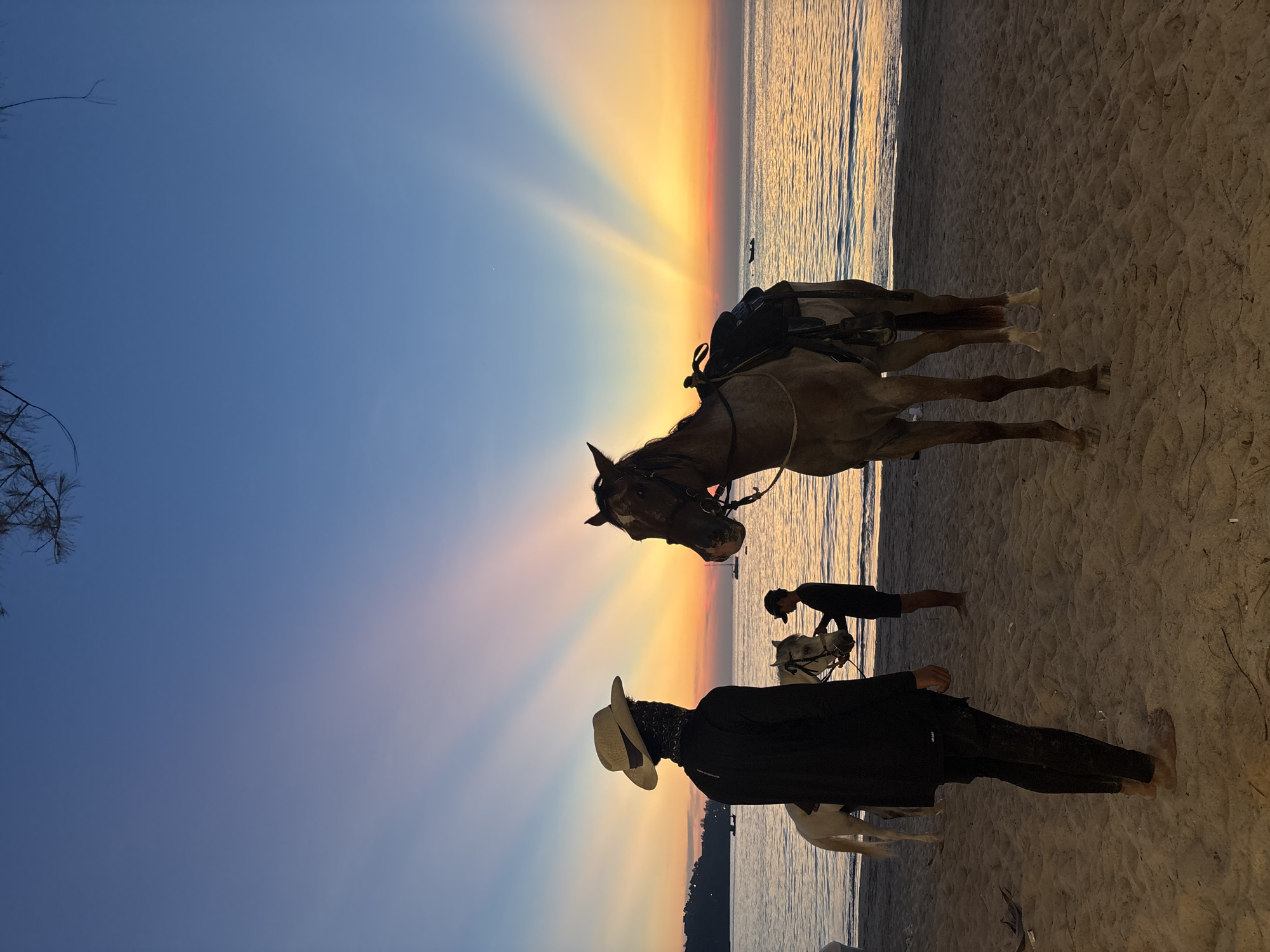sunset scene at Kamala Beach, Thailand. A horse with a saddle stands on the sand, partially in the water. A person is near the horse. In the foreground, a person wearing a hat and dark clothing stands with another horse. The sun sets on the horizon, casting rays into the sky. The sand is wet, reflecting the light.