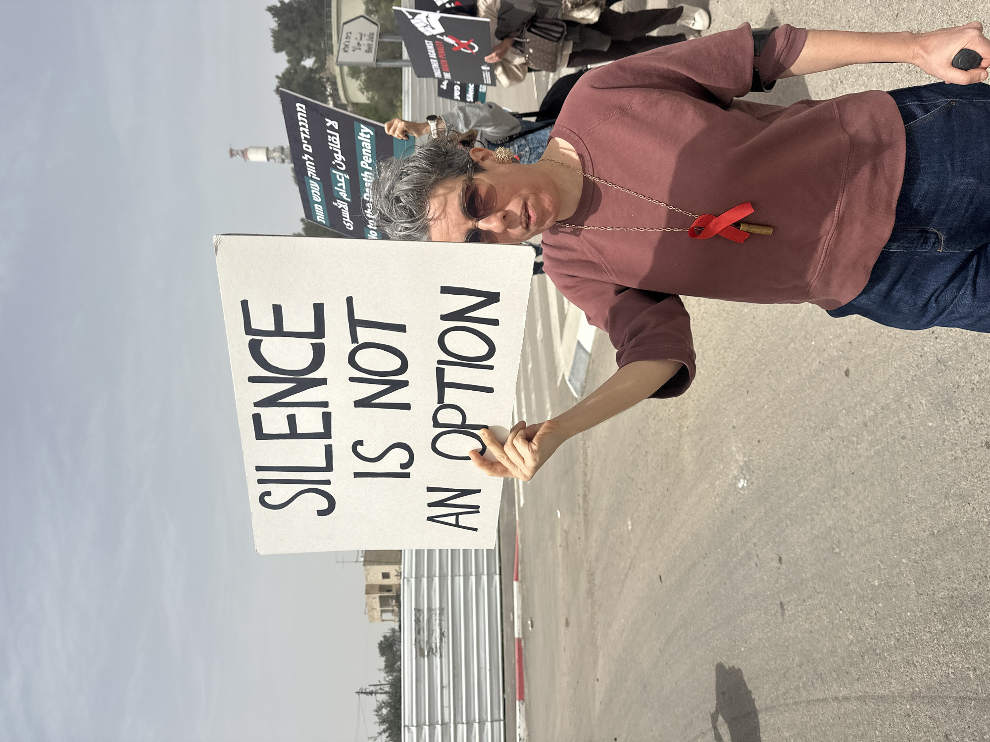 A woman stands on a street holding a sign that reads "SILENCE IS NOT AN OPTION." Other demonstrators and signs are visible in the background. The signs include Hebrew and Arabic text. The setting appears to be an urban street with buildings in the distance. A fence is visible on the lower left. One of the road signs shows بیت جالا (Beit Jala), which is a city in the Palestinian Territory near a-Doha. The woman is wearing jeans, a reddish-brown sweatshirt, sunglasses, and a necklace with a red ribbon.