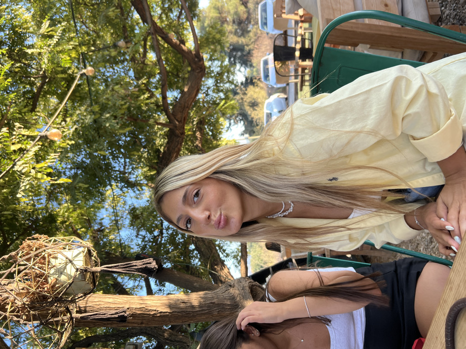 The image depicts two individuals seated at an outdoor establishment in Kfar Ruth, Israel, under a canopy of trees. In the central foreground, a young woman with long blonde hair, light skin, and dark eyes is observed, making a "pouty" expression with pursed lips while looking directly at the camera. She wears a light yellow collared shirt, possibly a Ralph Lauren polo given a visible logo, over a white tank top. A layered white beaded necklace and a silver bracelet are worn on her left wrist; her fingernails are painted white. Her hands rest on a light-colored wooden table. To her left, partially cropped, sits another young woman with long dark brown hair, wearing a white tank top, a small diamond pendant necklace, and a silver bracelet on her left wrist. Her right hand is near her ear, appearing to adjust her hair. The main subject is seated on a green metal chair. Overhead, dense green foliage from trees filters natural light. A macrame plant hanger containing dry plant material is suspended from a tree branch on the upper left. String lights with multiple exposed bulbs are strung across the tree branches. In the blurred background, several white parked vehicles are visible, alongside additional outdoor furniture.