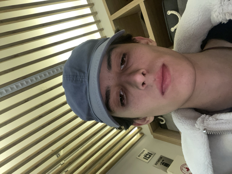 A person with dark hair and eyes, wearing a grey cap and a white jacket, poses for a selfie. Freckles are visible on their face. Behind them, a wall features light-colored, horizontal wooden slats. Two signs with symbols are positioned near the bottom right, suggesting a public or commercial space. Shelves are visible in the upper right corner. The image is slightly rotated.