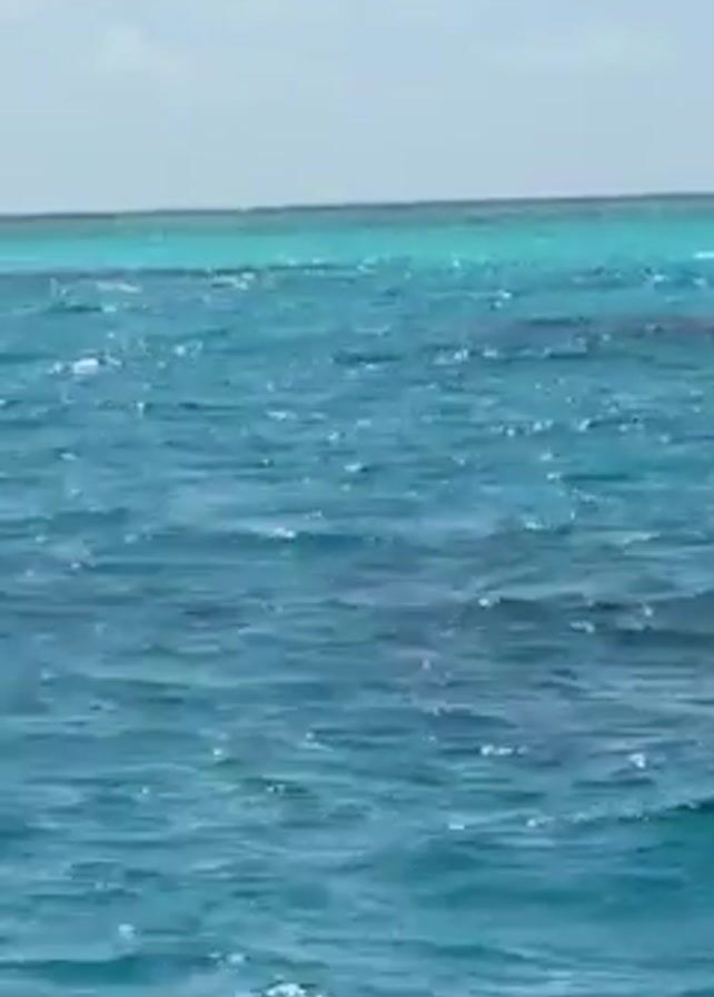 view of the ocean from what appears to be a boat. The water is blue and turquoise, with slight waves. The sky is light blue with some white clouds. At one point, a hand briefly appears in the bottom right corner of the frame. Background music can be heard.