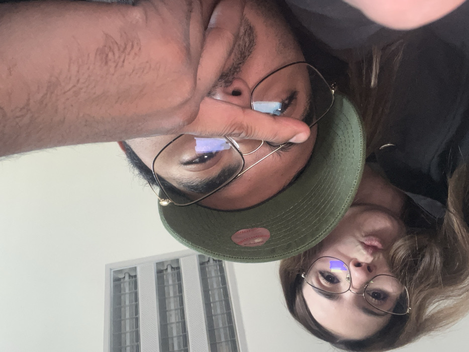 A selfie of a man and a woman, upside down. The man wears glasses and an olive-green baseball cap. His hand partially covers his face. The woman also wears glasses and has long, brown hair. Behind them, a window with vertical blinds is visible. The background appears to be a bright, white room.