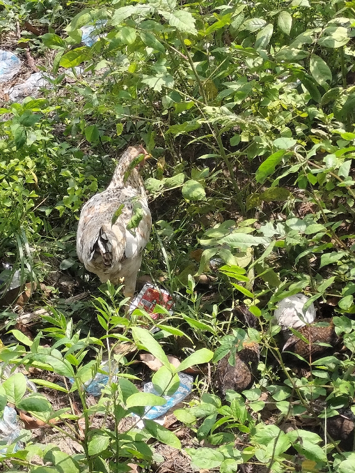This image, taken in Igbologun, Nigeria, depicts an outdoor scene dominated by dense green foliage. A mottled light brown and white chicken stands centrally, oriented towards the left, with its back and right flank visible, appearing to forage among the vegetation. In the lower right quadrant, two smaller, darker brown chickens or chicks are partially obscured by leaves, also engaged in foraging behavior. The ground beneath the vegetation, visible in patches, is covered with soil and scattered refuse, including crumpled blue plastic and a red and white wrapper. The scene is brightly lit by natural light.