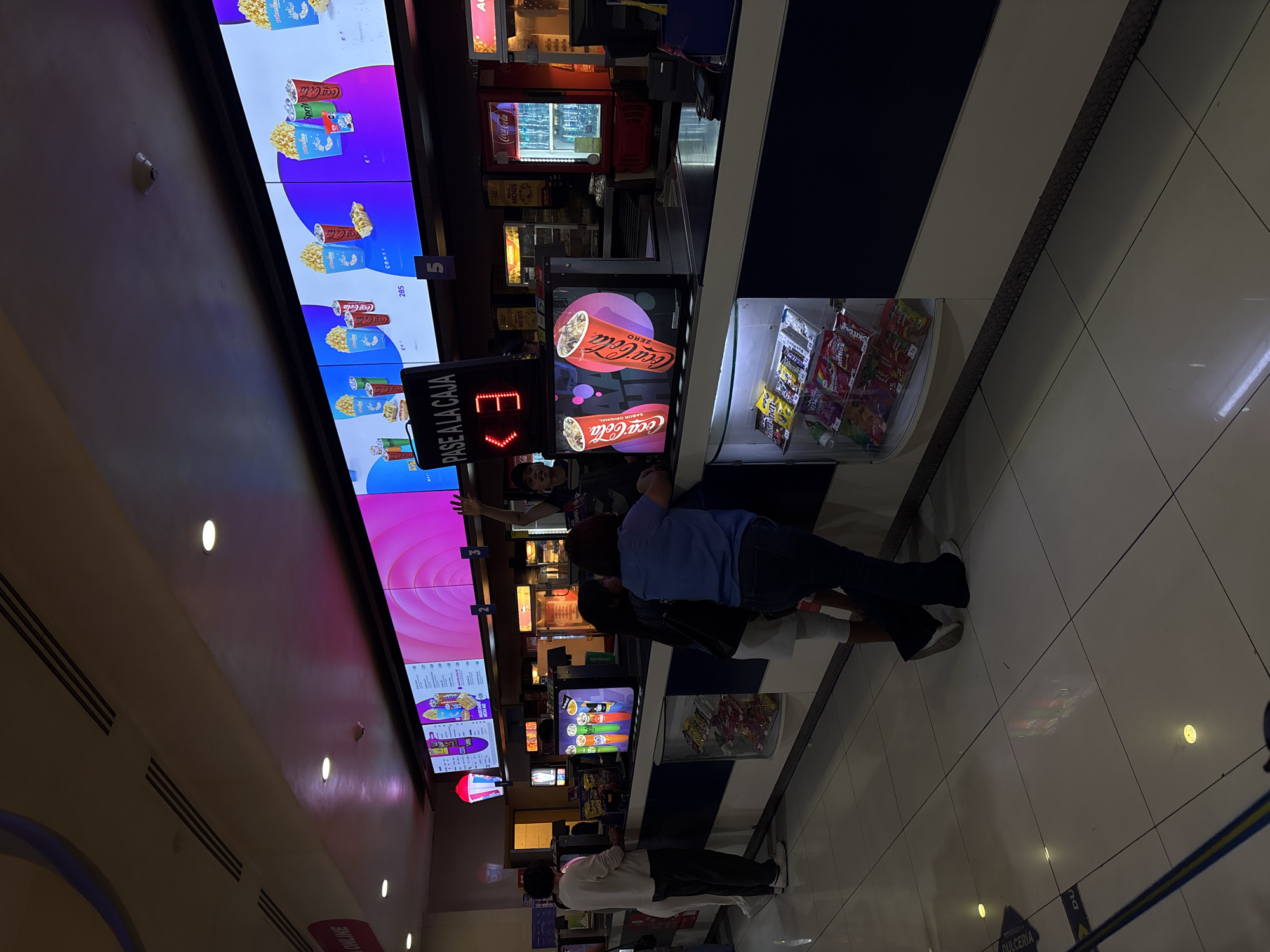brightly lit movie theater concession stand, most likely in the city of Puebla, Mexico, based on the presence of Spanish text on the menu boards. The scene features a long counter, with a digital menu displaying various food and beverage options, including Coca-Cola products and popcorn. Above the counter are several display screens showing colorful promotional graphics. A group of customers stands at the counter, presumably ordering food and drinks. One customer, wearing a blue shirt and jeans, is leaning over the counter, seemingly engaged in a conversation with a staff member. Snacks such as candy bars and beverages are displayed within reach for purchase. The floor is tiled, and the lighting is provided by recessed spotlights and illuminated displays. Overall, the image presents a typical movie theater concession area with a focus on food and drink offerings and customers making selections.