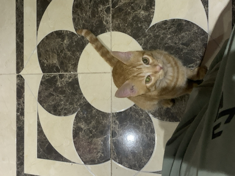 - "An orange tabby cat is depicted from a high-angle perspective, sitting on a tiled floor and looking directly upwards towards the camera" by FM-db0142, licensed under CC BY 4.0
