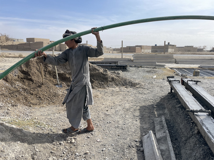 An outdoor scene in Nakhonay, Afghanistan, depicts a young male at a construction site under a clear, bright blue sky