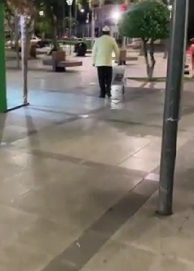 A man wearing a light green blazer and a white cap is seen from behind pushing a small white cart on a tiled walkway at night. Trees and benches are visible in the background, along with other figures sitting or standing in the distance. Street lights illuminate the scene. The walkway surface has a pattern of dark lines.