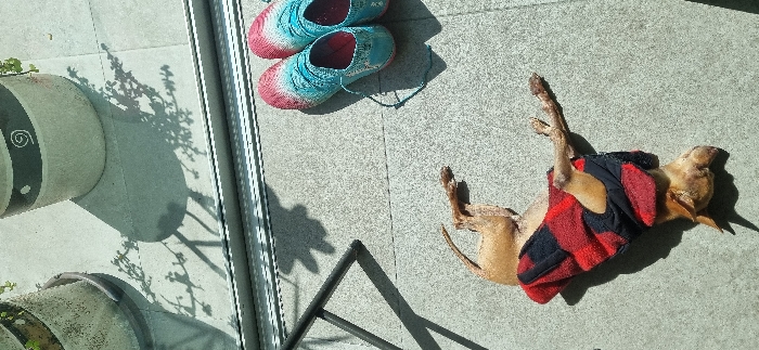 An aerial shot shows a dog in a red and black plaid jacket lying on its back on a concrete patio, with its legs in the air. Nearby are a pair of blue and pink sneakers. The patio is bordered by a glass door and window frame. To the left are two gray planters with plants. Shadows from the plants add to the scene.