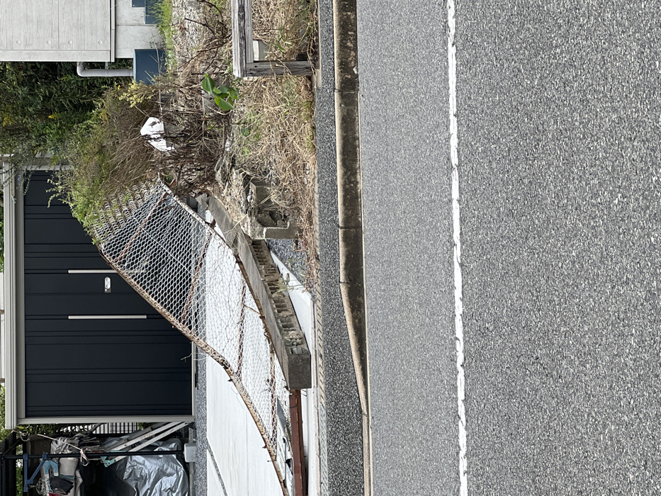 The image depicts a roadside scene in Chiba, Japan. In the foreground, an asphalt road with a dashed white lane marker transitions to a dark grey concrete curb. Beyond the curb, a segment of chain-link fencing, approximately 3-4 meters in length with a rusted metal frame and galvanized mesh, has collapsed. It rests diagonally across a low concrete barrier and a light grey concrete driveway. To the left, behind the collapsed fence, a modern dark grey storage shed or garage with two vertical silver door handles is visible. Adjacent to the shed, a silver tarp covers unidentified items, and a white ladder leans against an unseen structure. To the right of the fallen fence, an unkempt area of dense, dry, and green vegetation is present. Partially obscured within this foliage are a white plastic object and a wooden frame structure. In the background on the right, a light-colored concrete building with an external grey utility pipe is visible. No individuals are present in the scene, which is illuminated by natural daylight.