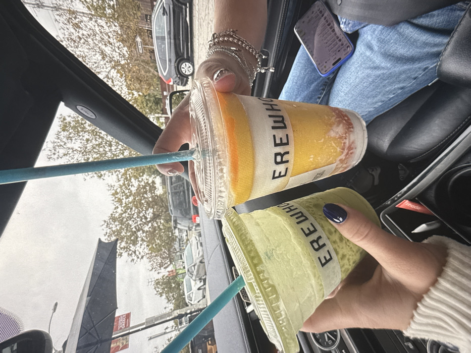 The image captures a scene from inside a vehicle parked on a commercial street in Los Angeles, United States, near an Erewhon market. Two distinct hands are visible, each holding a clear plastic cup branded "EREWHON" with a blue straw and lid. The left hand, exhibiting dark blue nail polish and wearing a white ribbed long-sleeved garment, holds a uniformly green beverage. The right hand, adorned with light-colored nail polish and multiple silver-toned bracelets, emerges from a blue denim garment and holds a layered beverage consisting of orange/yellow, white, and reddish components. A blue-cased smartphone rests on the right individual's lap. The vehicle's interior shows a black dashboard, a center console with a cup holder containing a white implement and a red packet, and black upholstery. Beyond the windshield, the overcast street scene features multiple vehicles, including a black SUV, white cars, and a black crossover. Trees with green foliage line the road. A commercial building is visible with a black outdoor umbrella. A partial red and white sign on the left reads "JUICES" above "GREEK." A white "ONE WAY" street sign is discernible on the right side of the background.