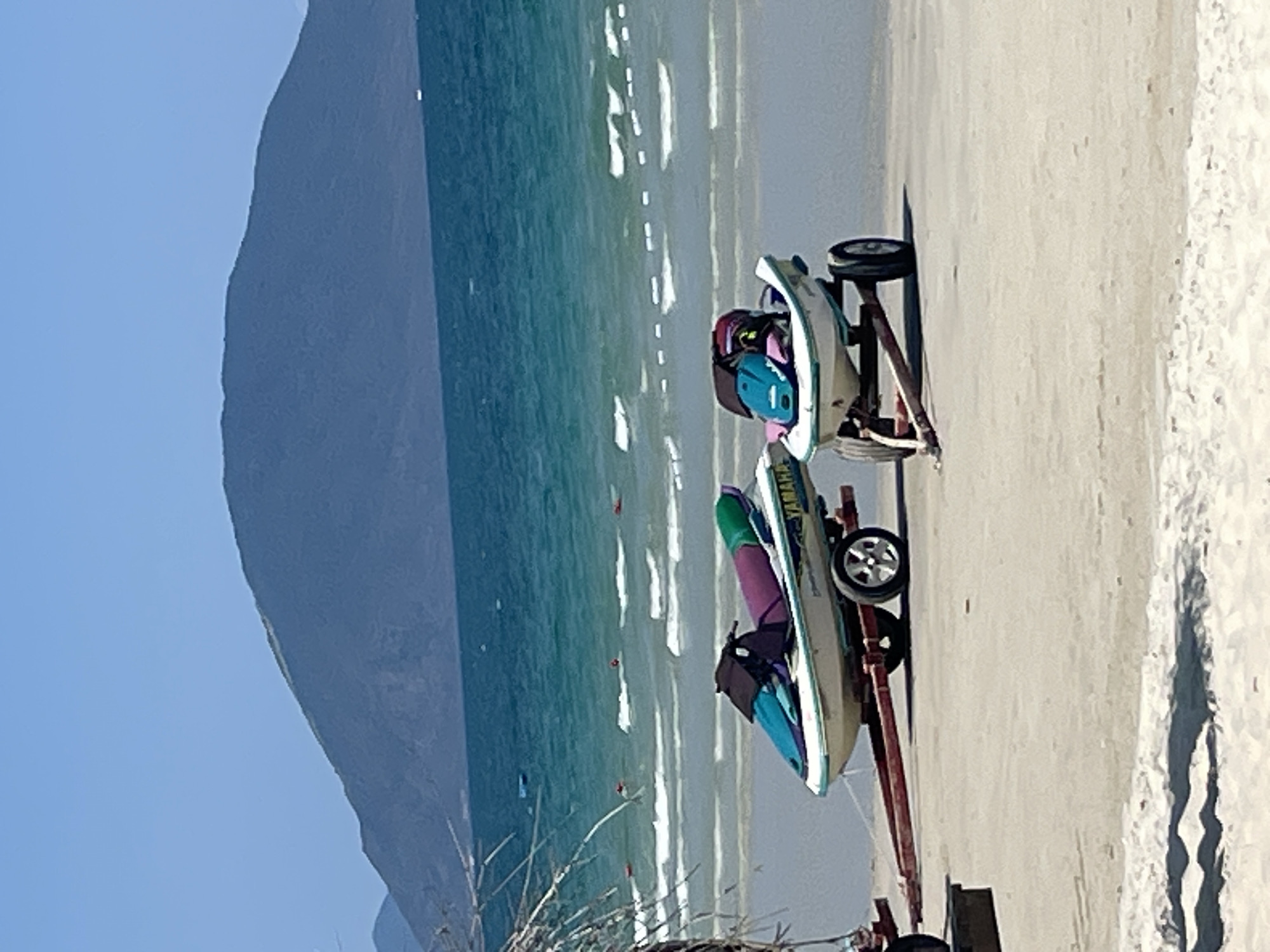 The image depicts a beach scene in Dong Ninh Hoa, Vietnam. Two Yamaha jet skis are parked on trailers on the sand near the water's edge. A mountain is visible in the background. The water is turquoise and has whitecaps. There are some red buoys in the water.