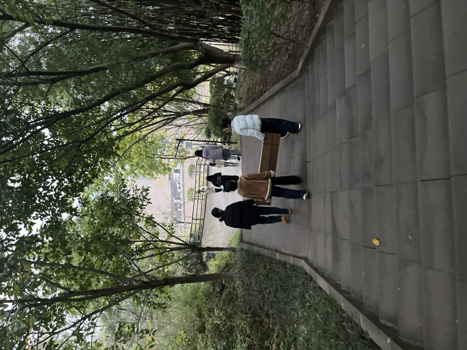 The image depicts an outdoor scene in Jiangjin, China. A group of individuals is descending a wide, grey stone staircase that is flanked by green trees and foliage on both sides. In the mid-ground, two individuals are collaboratively carrying a long, flat, rectangular wooden object down the stairs; the person on the left wears a brown jacket, and the person on the right wears a light blue puffy jacket. Ahead of them, a third individual in a dark puffy jacket walks down the steps. Further down the path, at the base of the stairs, several other individuals are visible walking on a paved area with a dark metal railing. Buildings with light-colored walls and dark roofs are partially visible in the distance through the trees, under an overcast sky. A single yellow leaf is present on one of the lower steps.