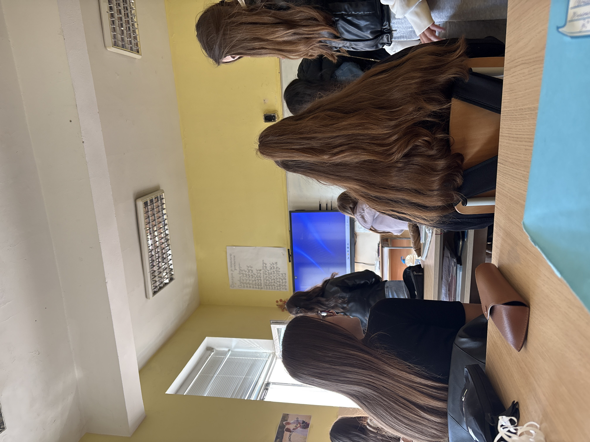 The scene depicts a classroom located in Cherven Bryag, Bulgaria. The room features yellow walls with a white dado rail, and a white ceiling with visible structural beams and two rectangular fluorescent light fixtures containing grilles. A large window with white horizontal blinds is positioned on the left wall, admitting bright natural light. At the front of the classroom, a large blue display screen is centrally mounted on the yellow wall. To its right, a white poster or board displaying handwritten text in Cyrillic script is affixed. Below the screen, a desk is partially visible. A small poster with the text "KINDNESS IS BEAUTIFUL" is visible on the left wall near the window. Approximately seven individuals, primarily young females, are present, consistent with a student population. In the immediate foreground, a female with long, straight, dark brown hair, wearing glasses and a black long-sleeved top, is seated at a wooden desk, facing slightly to her right. On her desk rests a brown faux-leather glasses case, a black pouch, and white elastic bands. A light blue folder is partially visible at the bottom right. Directly behind her, a second female with long, wavy, reddish-brown hair is seated, facing the front of the classroom; a black backpack is visible over her chair. To the right, a third female with long, wavy, dark brown hair stands, positioned with her back partially to the camera, wearing a black puffer-style jacket and light grey sweatpants. Additional students are visible in the mid-ground and background, mostly facing the front display. One female in a black leather-look jacket and blue jeans stands facing the screen. Another is partially visible wearing a light pink/beige top. The individuals are either seated at light-colored wooden desks with black chairs or standing, attending to the front of the classroom.