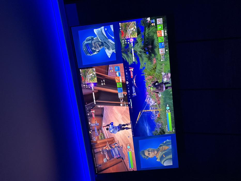 Location: Byala, Bulgaria. The image depicts a dimly lit interior space featuring a large, active digital display. A continuous strip of blue LED lighting is installed along the top edge of the visible ceiling, casting an upward blue glow. The display screen is configured to show four distinct views, indicative of the video game Fortnite. In the upper-left segment, a video game character, identifiable by a blue and white jacket and holding a firearm, stands within a wooden structure. A second character is partially visible to the left. The upper-right segment displays a rendered portrait of a male video game character wearing blue futuristic eyewear. The lower-left segment presents a rendered portrait of a different male video game character with light brown hair and a tan vest. The lower-right segment illustrates a video game character, dressed in a dark jacket and a green backpack, traversing a grassy outdoor environment with visible pine trees and a distant goalpost structure. All four game views include active user interface elements, such as health bars, miniature maps, and item slots. The wall beneath the display is dark and unadorned.
