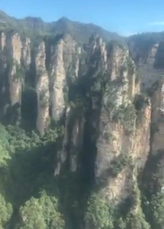 landscape of towering rock formations covered in green vegetation, resembling pillars stretching towards a clear blue sky. These formations are nestled among rolling hills and mountains. The camera appears to be moving, suggesting it's possibly taken from a vehicle or elevated platform, panning to offer a wider view of the landscape. A person’s hands appear briefly holding a mobile phone, indicating someone is taking a photo or video of the scenery.