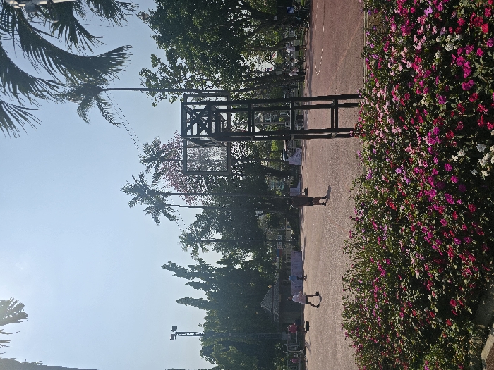 An outdoor scene in Chiang Mai City Municipality, Thailand, is depicted under bright daylight with a clear sky. In the immediate foreground, a dense flowerbed exhibits various shades of pink, fuchsia, red, and white blossoms. Behind the flowerbed, a large, reddish-brown paved court occupies the midground. A dark-colored, industrial-style basketball hoop structure, constructed from square metal beams, stands prominently on the right side of the court, extending into the upper midground. Approximately six to eight individuals are present on the court. On the left side, two figures in light-colored attire are visible near a small set of poles, possibly indicating a recreational game. A third individual, also in light clothing, is in motion towards the left-center. On the right, another person in dark clothing stands with their back to the camera near the basketball hoop. Additional indistinct figures are present further back on the court. In the background, a small pavilion with a dark, multi-tiered roof is visible on the left. The area is heavily vegetated with numerous tall trees, including various palm species and some trees with reddish-pink blossoms. A tall light pole structure is visible on the far left amidst the trees. White draped materials or temporary structures are also discernible on the right side of the background.