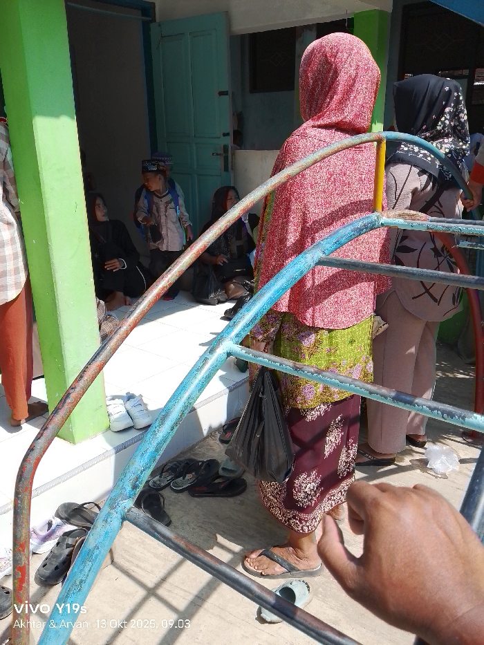 This image depicts a sunlit outdoor scene at an entrance in Jagapura Kidul, Indonesia, dated October 13, 2025, at 09:03. In the foreground, a right hand with tanned skin grips a blue and rust-colored metal railing that spans horizontally across the lower and mid-sections of the frame. The railing suggests a barrier or part of an outdoor structure. Behind the railing, a group of individuals is gathered near a building entrance with a raised white-tiled step. A woman, central in the mid-ground, is viewed from behind, wearing a red and white speckled long-sleeved top, a green patterned mid-section garment, and a maroon patterned long skirt. She wears black flip-flops and holds a black plastic bag in her left hand. To her right and partially obscured, another woman is visible from behind, wearing a black patterned hijab, a light brown long-sleeved top, and dark trousers or a skirt, along with dark flip-flops. On the white-tiled step leading to the building's entrance, several pairs of shoes and sandals, including white sneakers and various dark flip-flops, are neatly arranged, indicating they have been removed before entry. Inside the doorway, a young boy with a light brown long-sleeved shirt, dark pants, a patterned cap, and a light blue backpack stands, looking towards the left. To his left, a woman in a black hijab and dark clothing sits on the tiled floor, looking towards the boy. Another woman in dark clothing and a head covering is partially visible, sitting to the boy's right. On the far left, a person wearing a plaid shirt and light brown pants stands near a green structural pillar. The building features a light blue double door in the background.