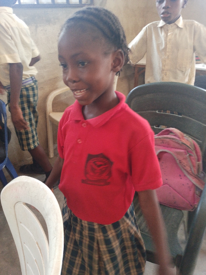 An indoor scene is captured in the city of Unknown, Unknown, featuring three children within a room furnished with plastic chairs. The central subject is a young Black female child, approximately 7-9 years old, with braided hair, standing and smiling towards the left, revealing her teeth. She wears a red short-sleeved polo shirt with a dark, circular emblem on the left chest, and a blue, green, and tan plaid pleated skirt. To her left, a young Black male child is partially visible from the mid-thigh down, wearing plaid shorts of a similar pattern and dark shoes, standing. In the mid-background, to the right of the central girl, a young Black male child is visible from the chest up, wearing a light-colored collared shirt and looking forward with a neutral expression. The environment includes light-colored, plain walls and a window with multiple panes in the upper background, allowing natural light into the space. A white plastic chair is partially visible in the lower-left foreground. Behind the central girl, a dark-colored plastic chair holds a pink backpack displaying dark markings. Another light-colored plastic chair is positioned in the mid-background. No direct interactions between the individuals are depicted.