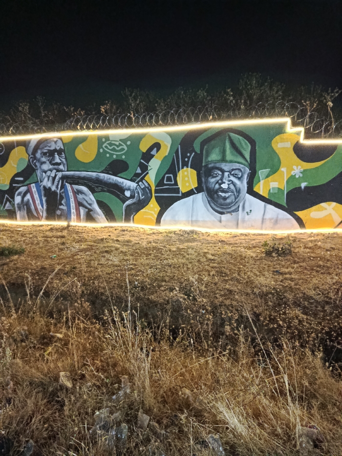 A vibrant mural depicts two men against a backdrop of green, black, and yellow abstract shapes. The man on the left is blowing a horn, while the man on the right is wearing a hat. The mural is illuminated by a string of lights. Barbed wire runs along the top of the wall. The foreground features dry grass and litter. The sky is dark.