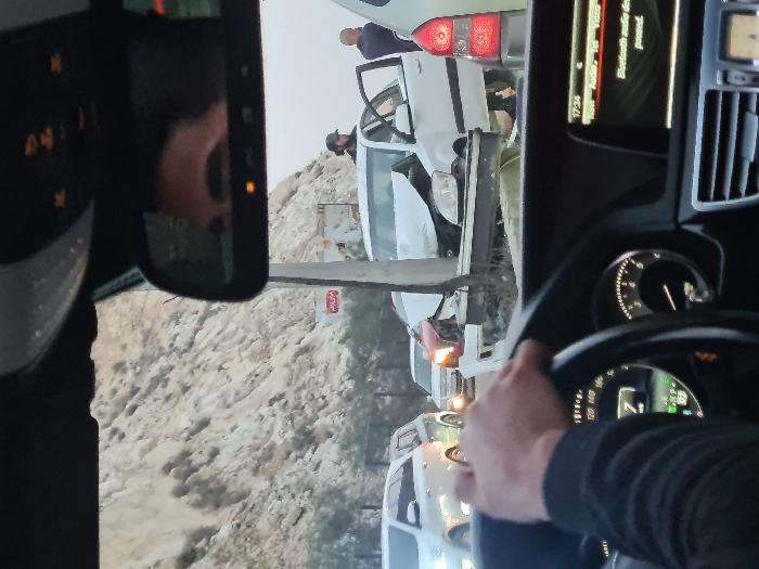 A view from inside a car shows a traffic accident. A white car is severely damaged, with debris scattered around it. People are visible near the wrecked vehicle. Traffic is backed up behind the accident. The car's dashboard and steering wheel are partially visible. The side mirror reflects the scene, adding another perspective of the chaotic situation. The landscape appears arid.